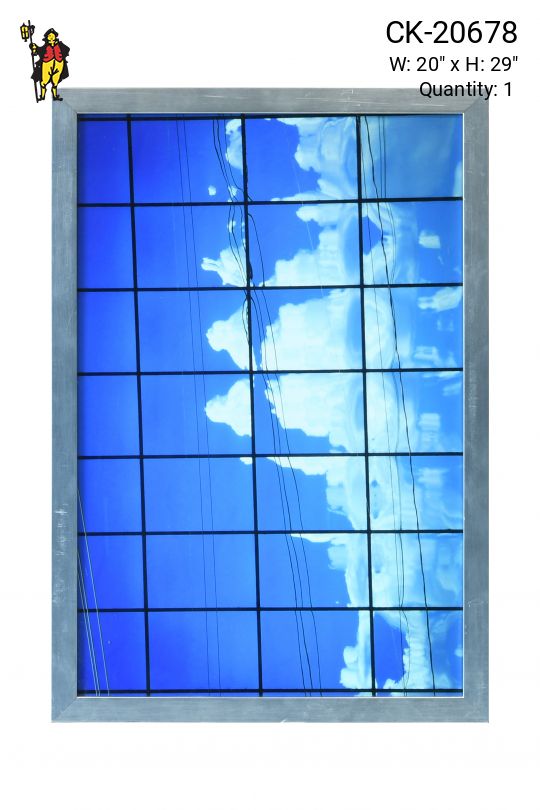 Modern minimalist photograph with a row of windows reflecting clouds in a grid like pattern