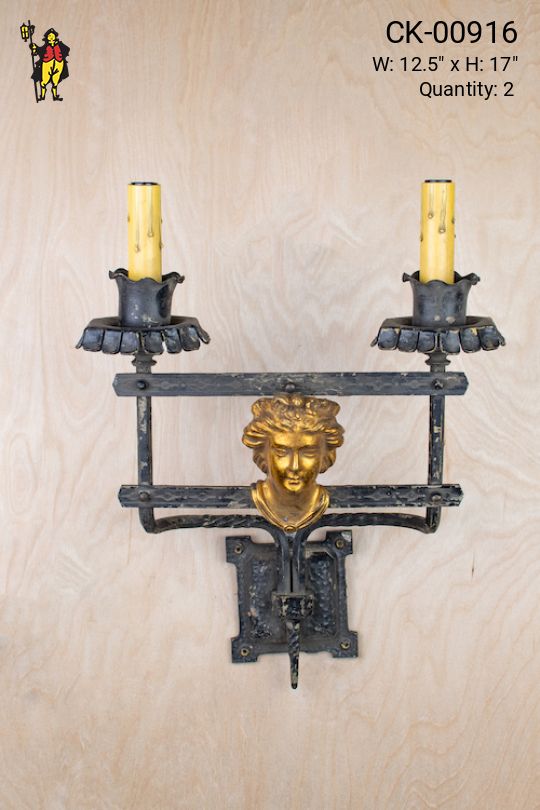Wrought Iron Gothic Two Candle Wall Sconce w/Brass Bust